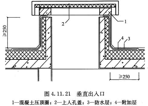 4.11.21 屋面垂直出入口泛水处应增设附加层,附加层在平面和立面的宽度均不应小于250mm;防水层收头应在混凝土压顶圈下(图4.11.21)。